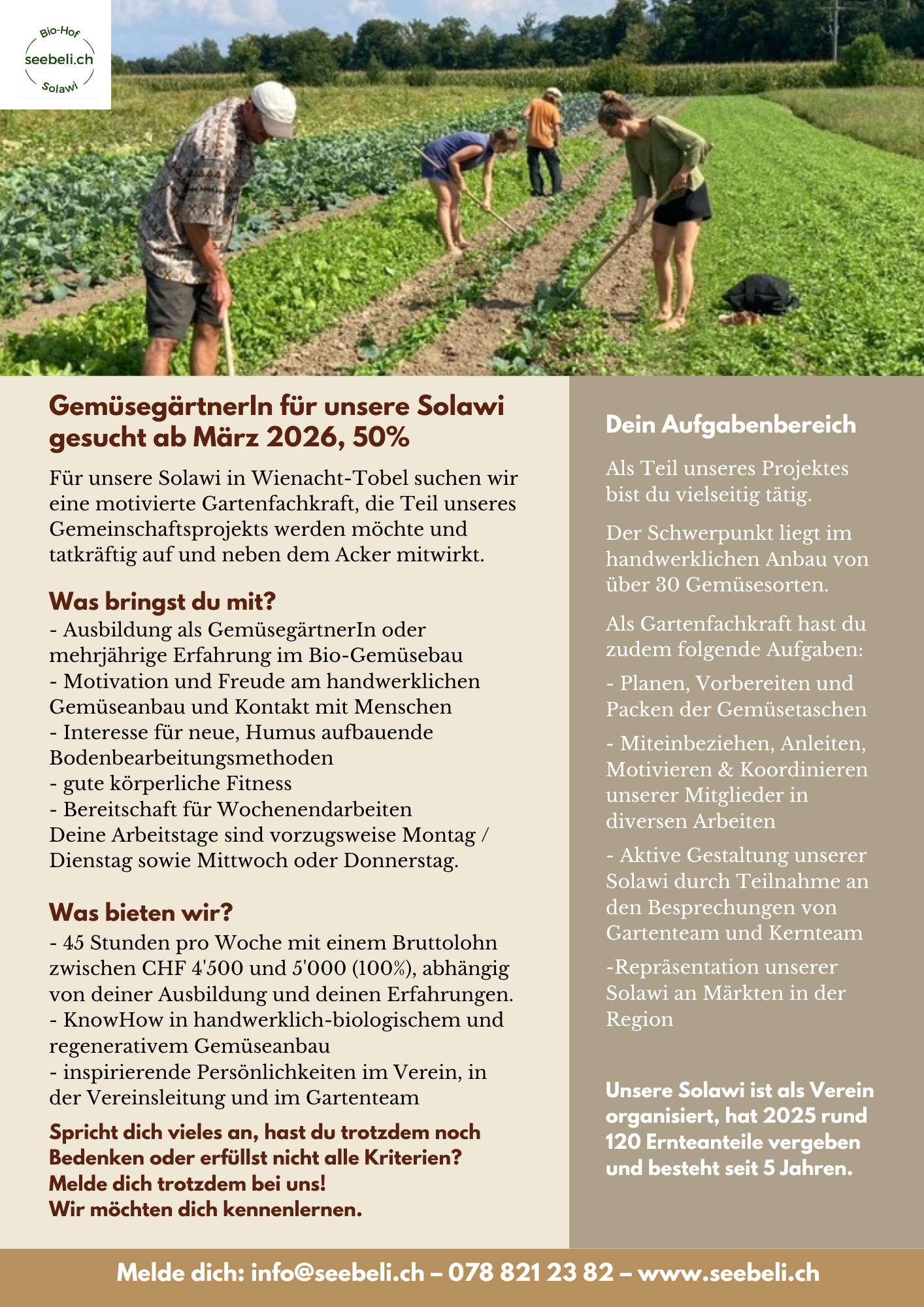 Wir suchen für unsere SOLAWI eine Gartenfachkraft für ein Pensum von 50% ab März 2026. Bevorzugte Arbeitstage sind Montag, Dienstag und Mittwoch oder Donnerstag.